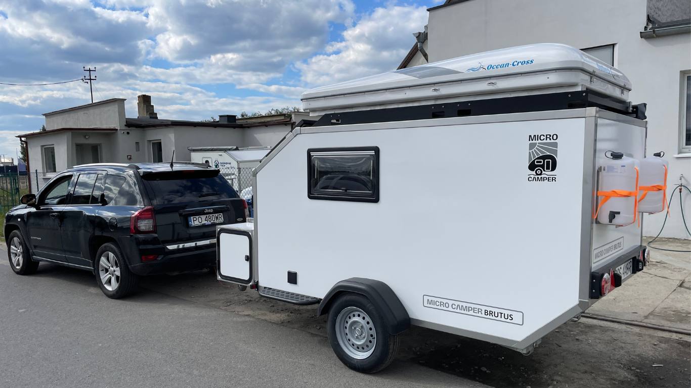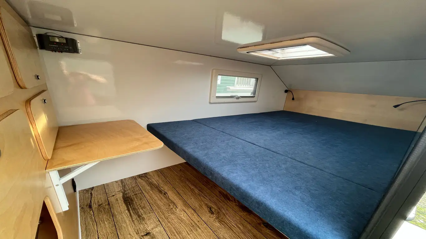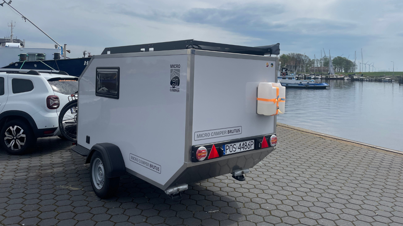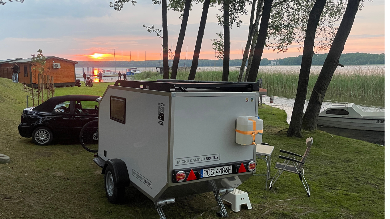 Brutus to lekka i kompaktowa przyczepka, która poradzi sobie nawet w trudnym terenie. Dzięki dużym 14-calowym kołom i szerokiemu rozstawowi kół jest stabilna i łatwa w prowadzeniu. Waży 530 kg, a dodatkowy ładunek może mieć do 220 kg, więc całkowita masa to 750 kg – wystarczy prawo jazdy kat. B. W środku znajdziesz przestrzeń do spania o wymiarach 1,95 x 1,34 m, którą można szybko przekształcić w miejsce do siedzenia. Przyczepka jest samowystarczalna energetycznie – panel słoneczny na dachu ładuje akumulator. Wyposażona jest w lodówkę, palnik gazowy i markizę zewnętrzną.