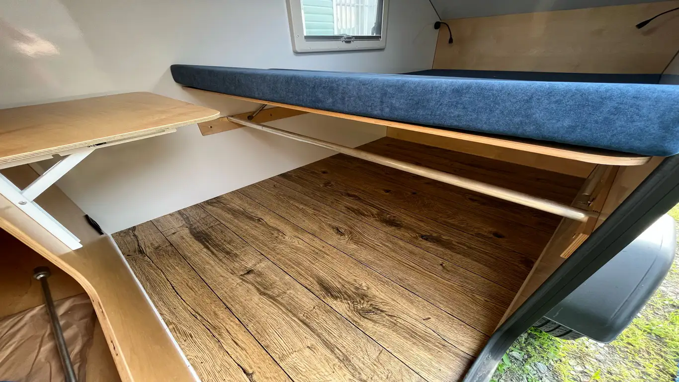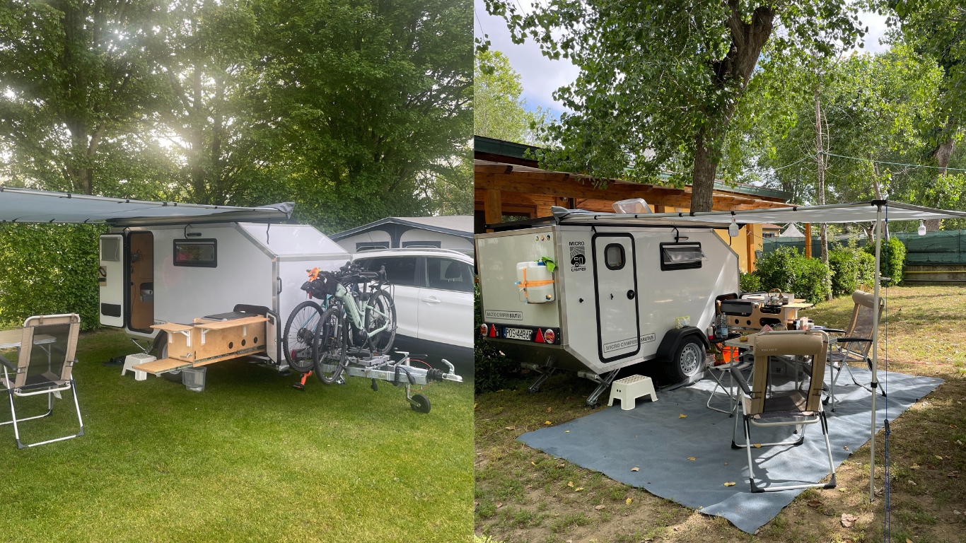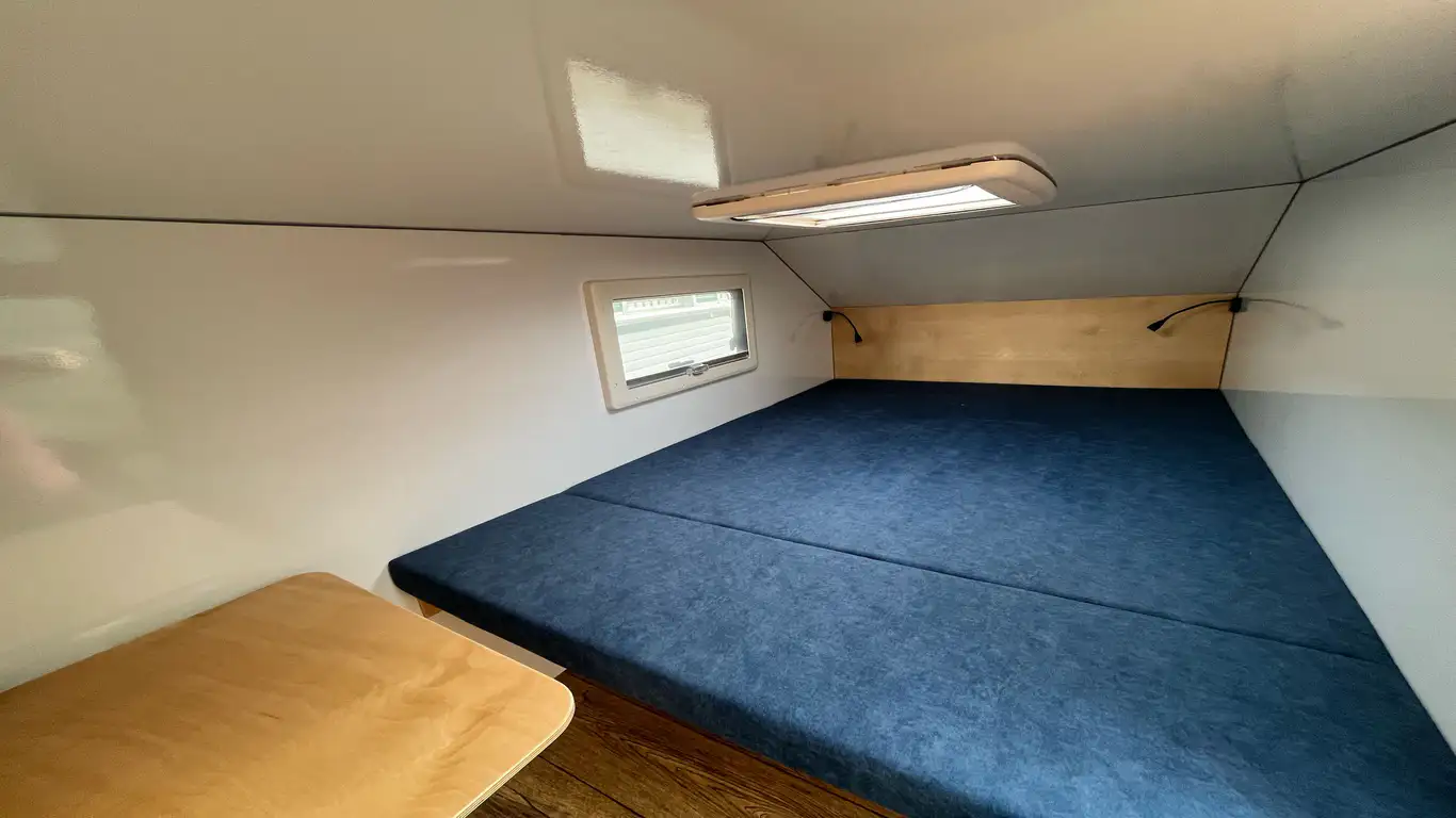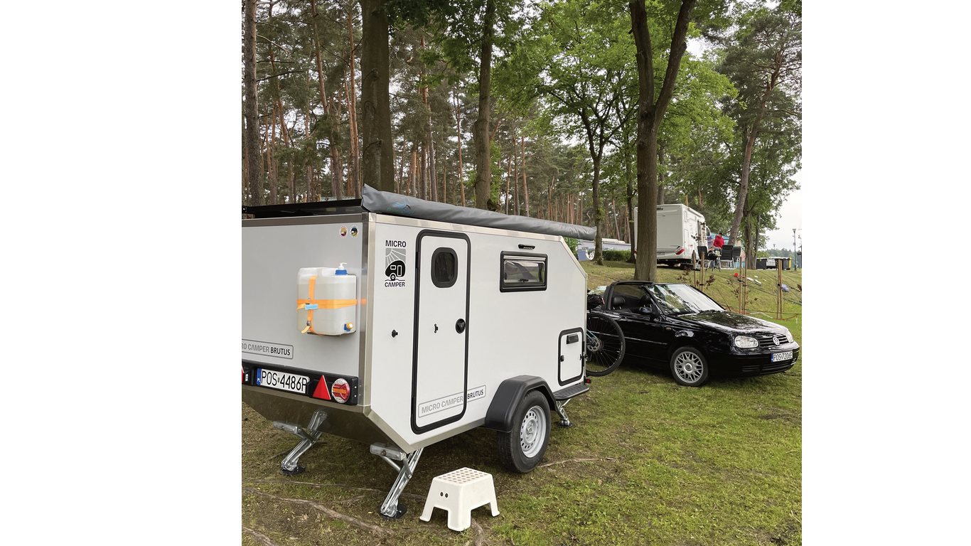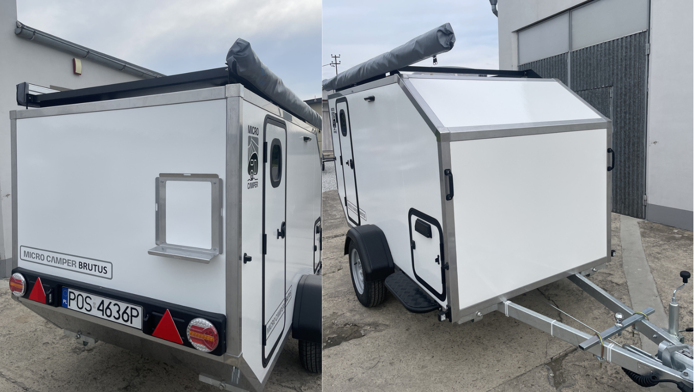Brutus to lekka i kompaktowa przyczepka, która poradzi sobie nawet w trudnym terenie. Dzięki dużym 14-calowym kołom i szerokiemu rozstawowi kół jest stabilna i łatwa w prowadzeniu. Waży 530 kg, a dodatkowy ładunek może mieć do 220 kg, więc całkowita masa to 750 kg – wystarczy prawo jazdy kat. B. W środku znajdziesz przestrzeń do spania o wymiarach 1,95 x 1,34 m, którą można szybko przekształcić w miejsce do siedzenia. Przyczepka jest samowystarczalna energetycznie – panel słoneczny na dachu ładuje akumulator. Wyposażona jest w lodówkę, palnik gazowy i markizę zewnętrzną.
